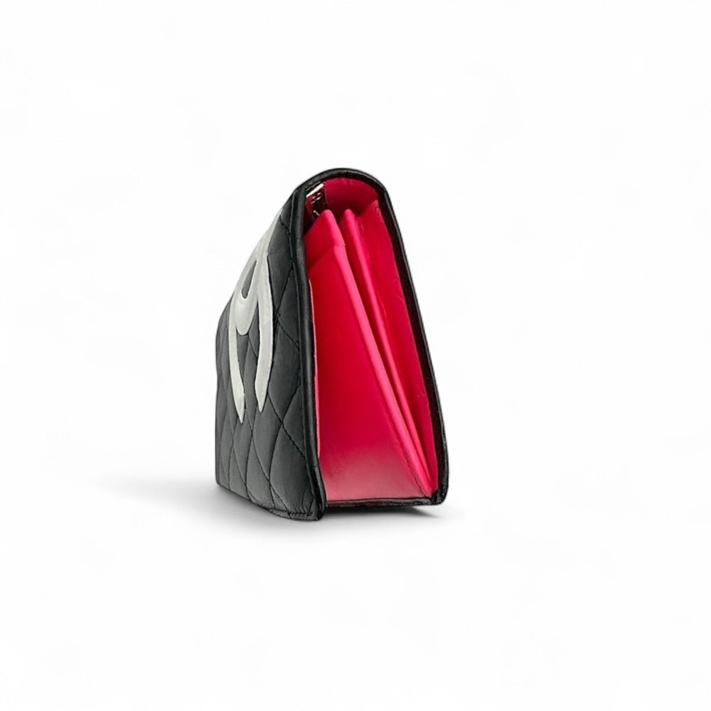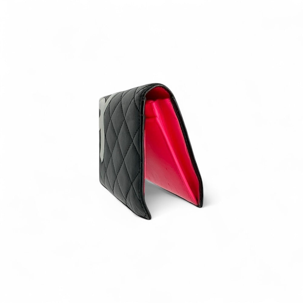 Dies ist eine originale CHANEL Cambon Yen Geldbörse aus gestepptem Kalbsleder in Schwarz und Pink. Diese stilvolle, zweifach gefaltete Geldbörse ist wunderschön aus schwarzem, rautengestepptem Kalbsleder mit weißem Chanel CC-Logo-Patch aus Leder gefertigt. Die Geldbörse öffnet sich zu einem rosafarbenen Innenraum mit geprägtem Chanel CC-Logo, Kartenfächern, aufgesetzten Taschen und einem Münzfach mit Reißverschluss. Das weiße CC-Logo auf der Vorderseite wurde übermalt, um Farbübertragungen zu reparieren. Abgesehen davon befindet sich die Geldbörse in ausgezeichnetem Zustand. Sie wird mit der Original-Echtheitskarte geliefert.