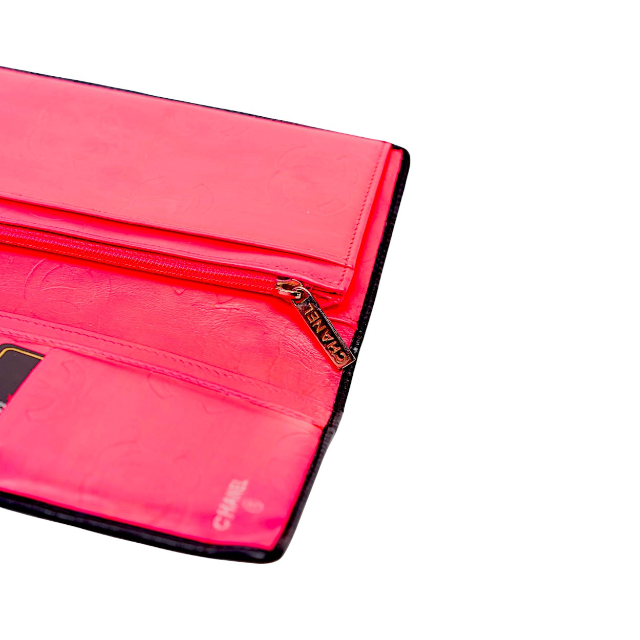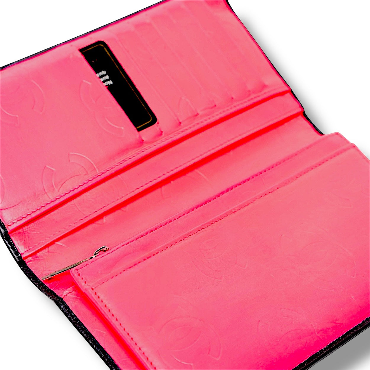 - Farbe: Schwarzes Kalbsleder mit weißem CC-Logo und rosa Lederinnenausstattung