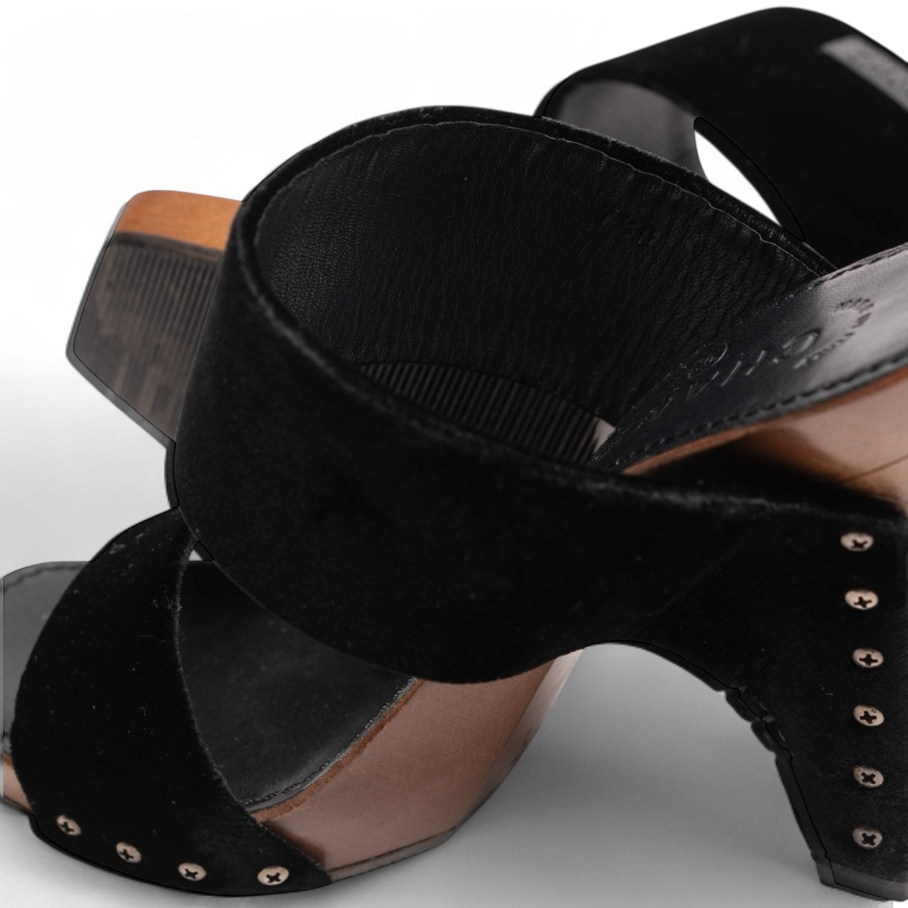 Chanel Vintage-Kollektion 2003: 12,7 cm hohe Plateau-Sandalen aus schwarzem Samt mit Doppelriemen und Holzsohle. Die Absätze wurden ausgetauscht und die Sandalen professionell neu besohlt. Die Sandalen wurden einmal getragen und werden mit Originalkarton und Schuhstaubbeuteln geliefert.