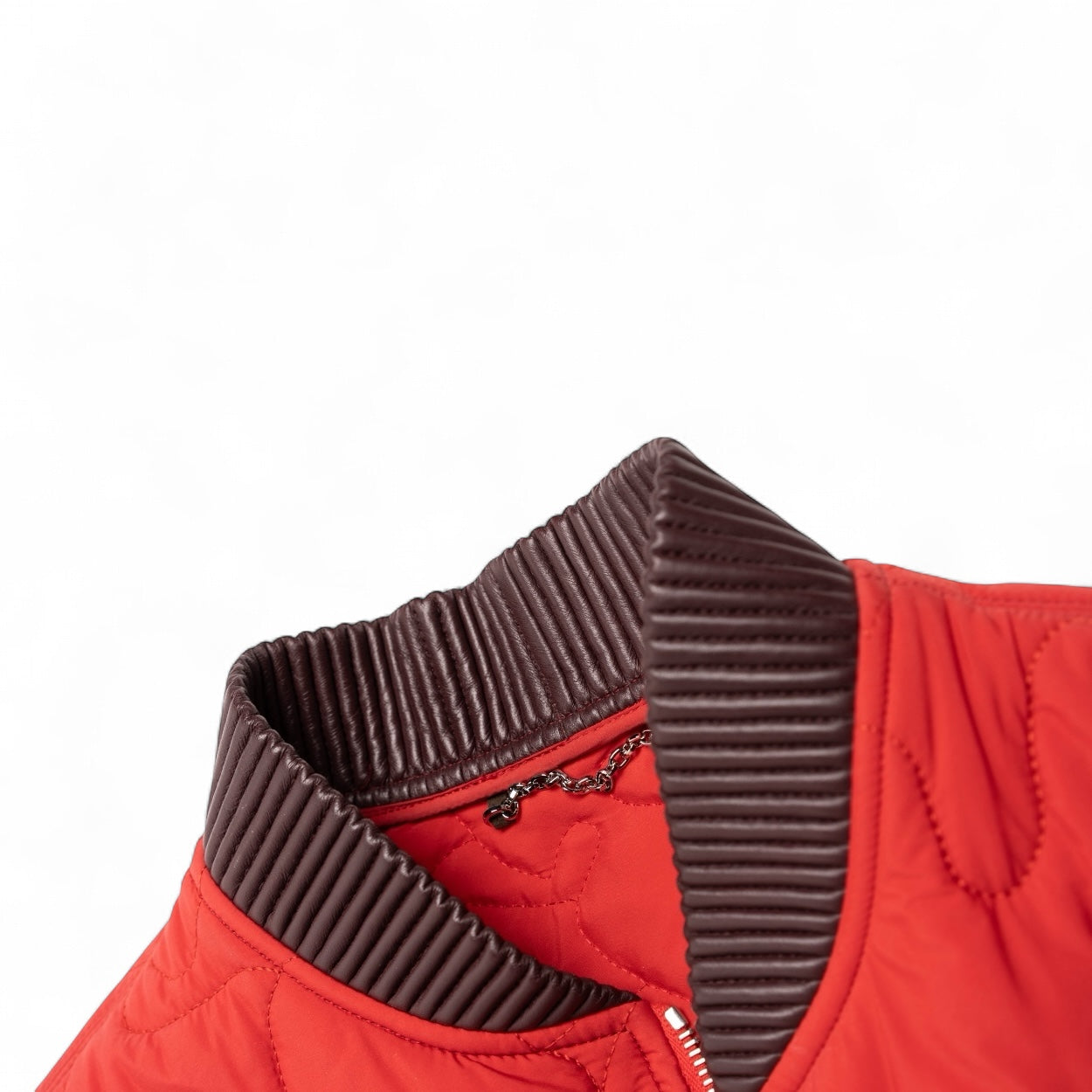 This men's authentic, pre-owned Louis Vuitton quilted polyamide vest in red showcases silver-toned hardware and a faux leather collar. The vest displays the LV monogram meticulously stitched across the design. It remains in excellent pre-owned condition.