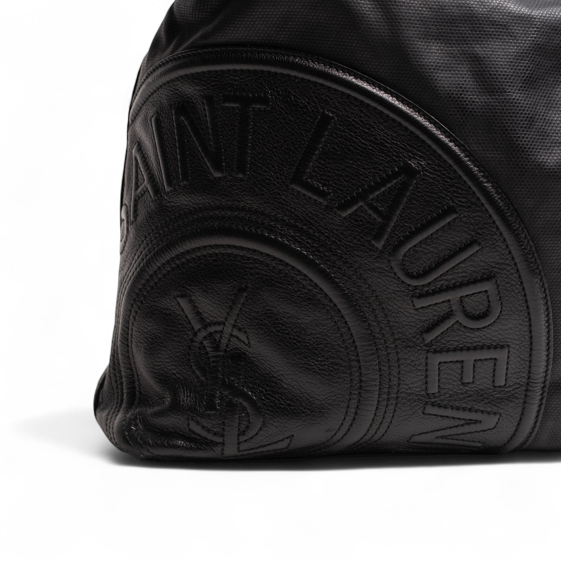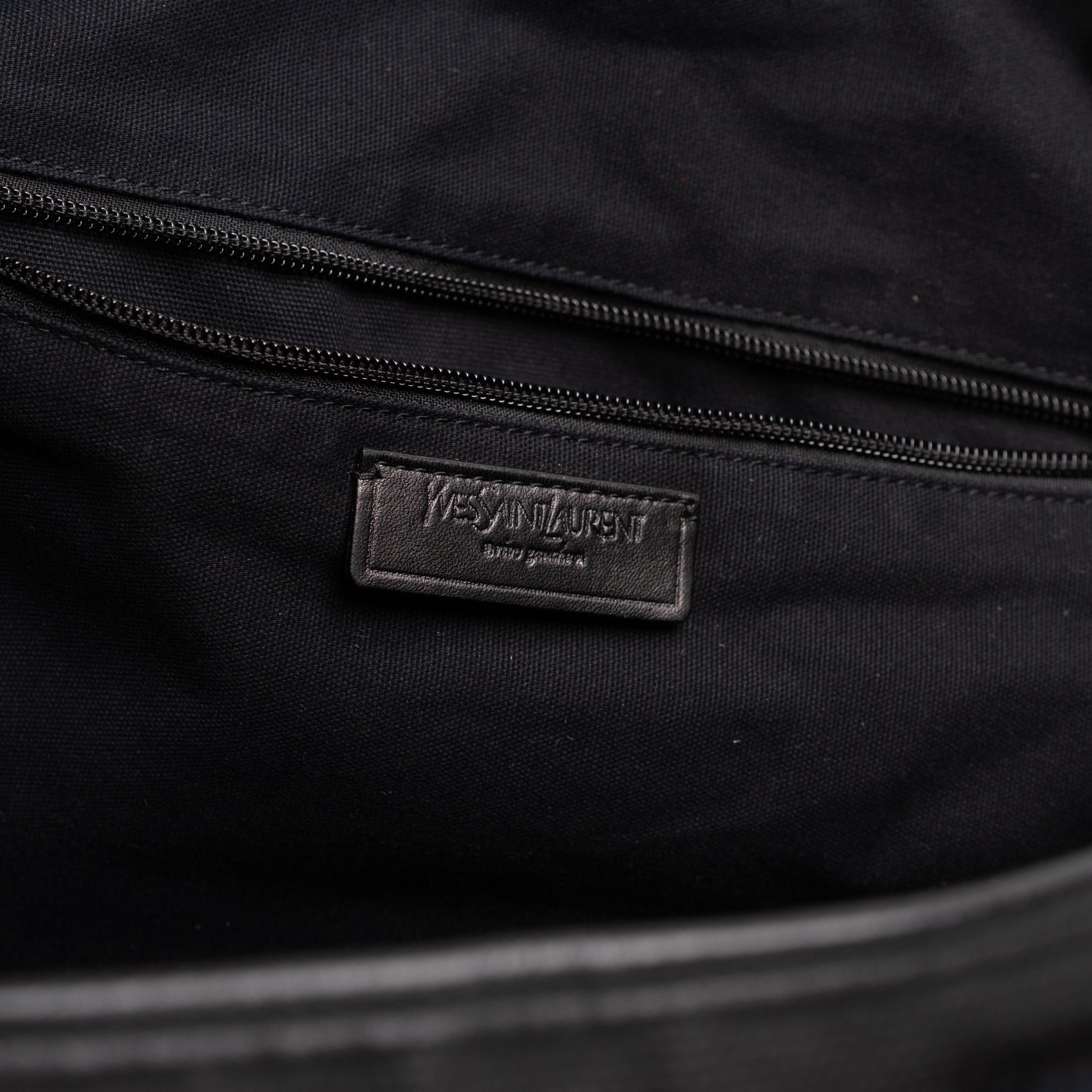 Authentische, gebrauchte YSL-Tasche aus schwarzem Canvas in Übergröße mit schwarzem YSL-Logo aus Leder auf der Vorderseite. Diese Tasche bietet Platz für einen Laptop und ist perfekt für Reisen, Schule oder Arbeit.
