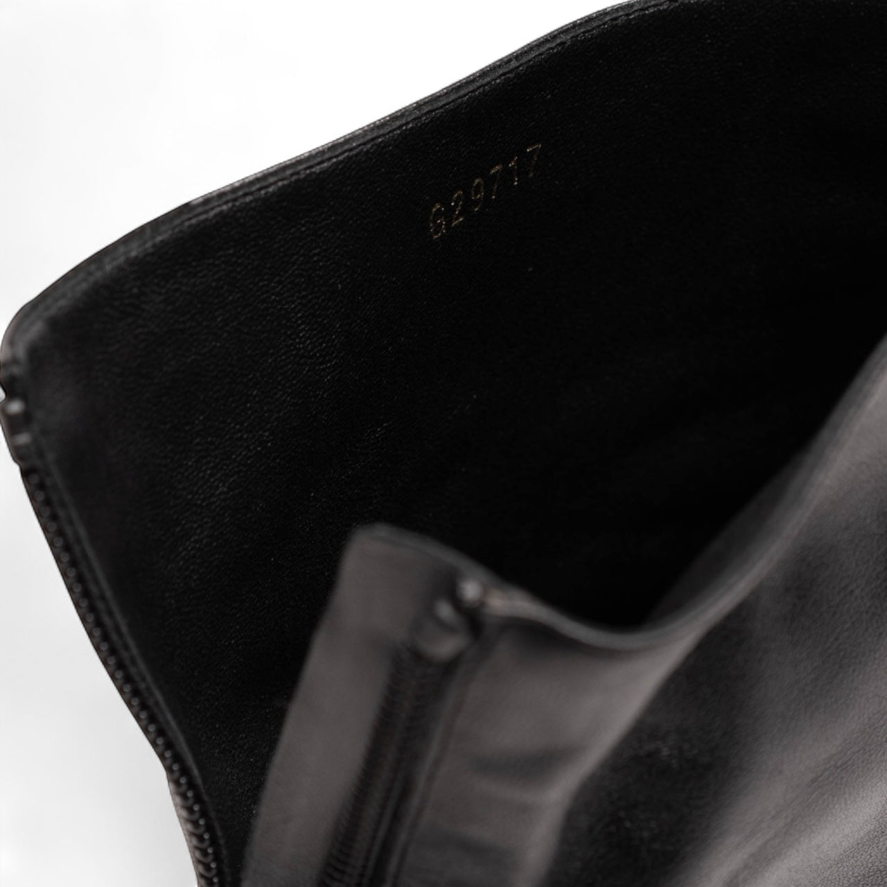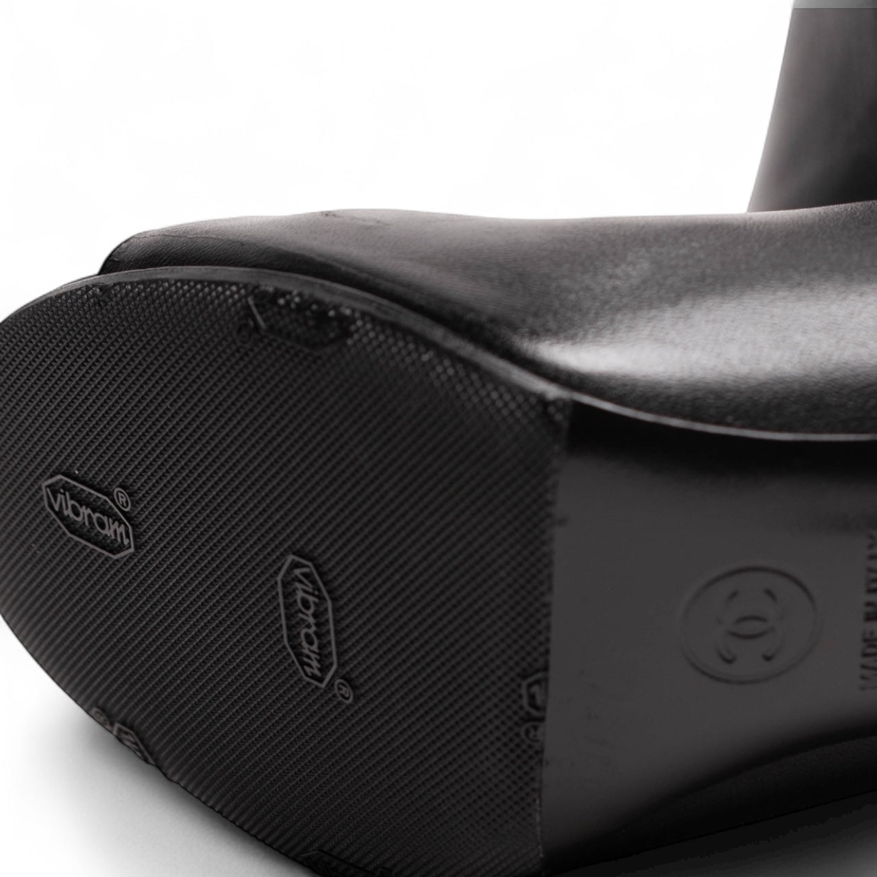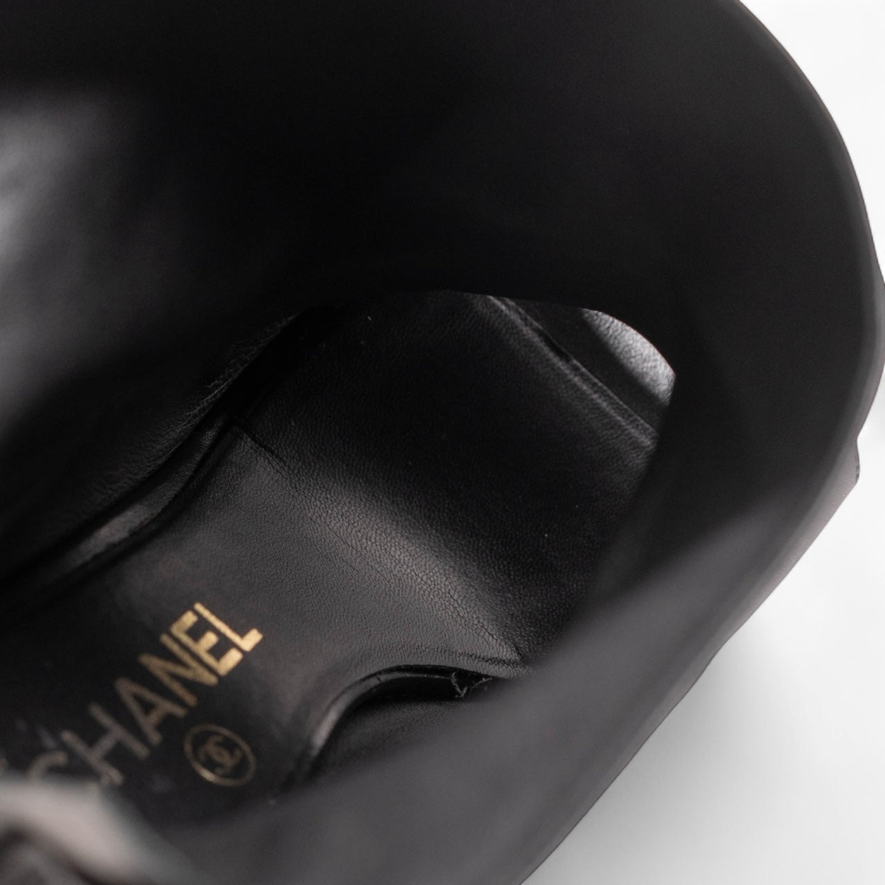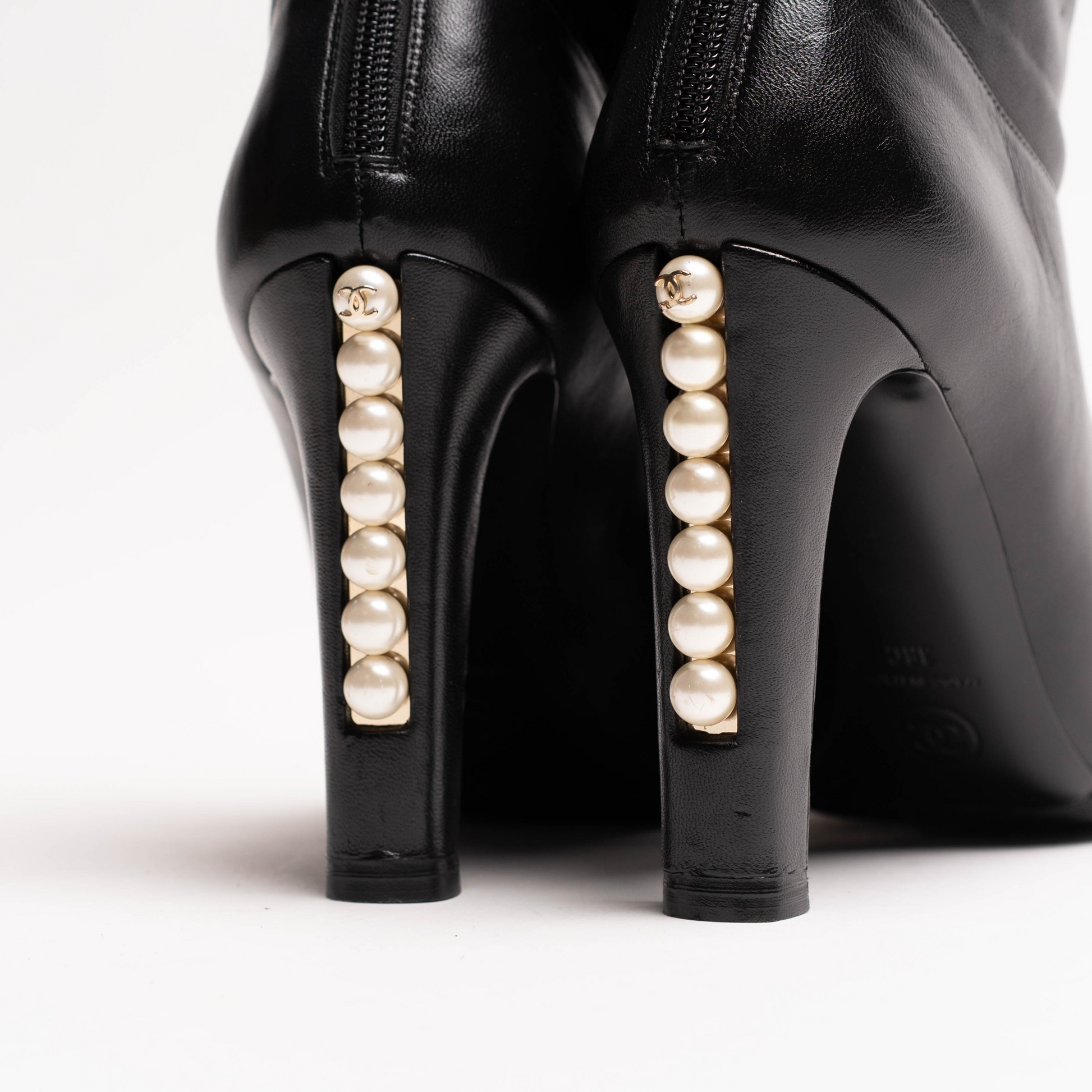 These authentic, pre-owned vintage Chanel ankle boots are made from black calfskin and showcase pearl detailing on the heels alongside an open-toe design. Equipped with a back zipper closure, they easily shift from casual daytime wear to formal occasions. In EU size 38, their adaptable style complements a range of outfits, from wide-leg pants to elegant miniskirts. The refined open-toe shape, accented by the signature champagne-colored pearls on the heels, delivers a sophisticated touch to every step you take.