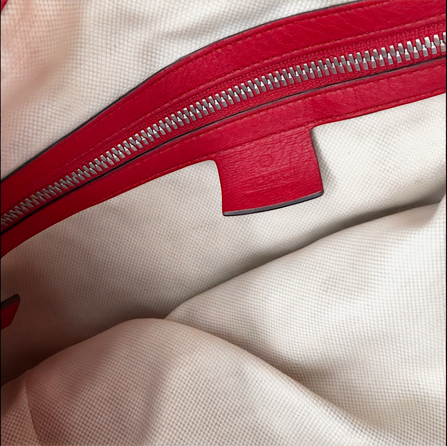 • Color: Tabasco (red) pebbled leather with off-white canvas lining with silver-tone hardware