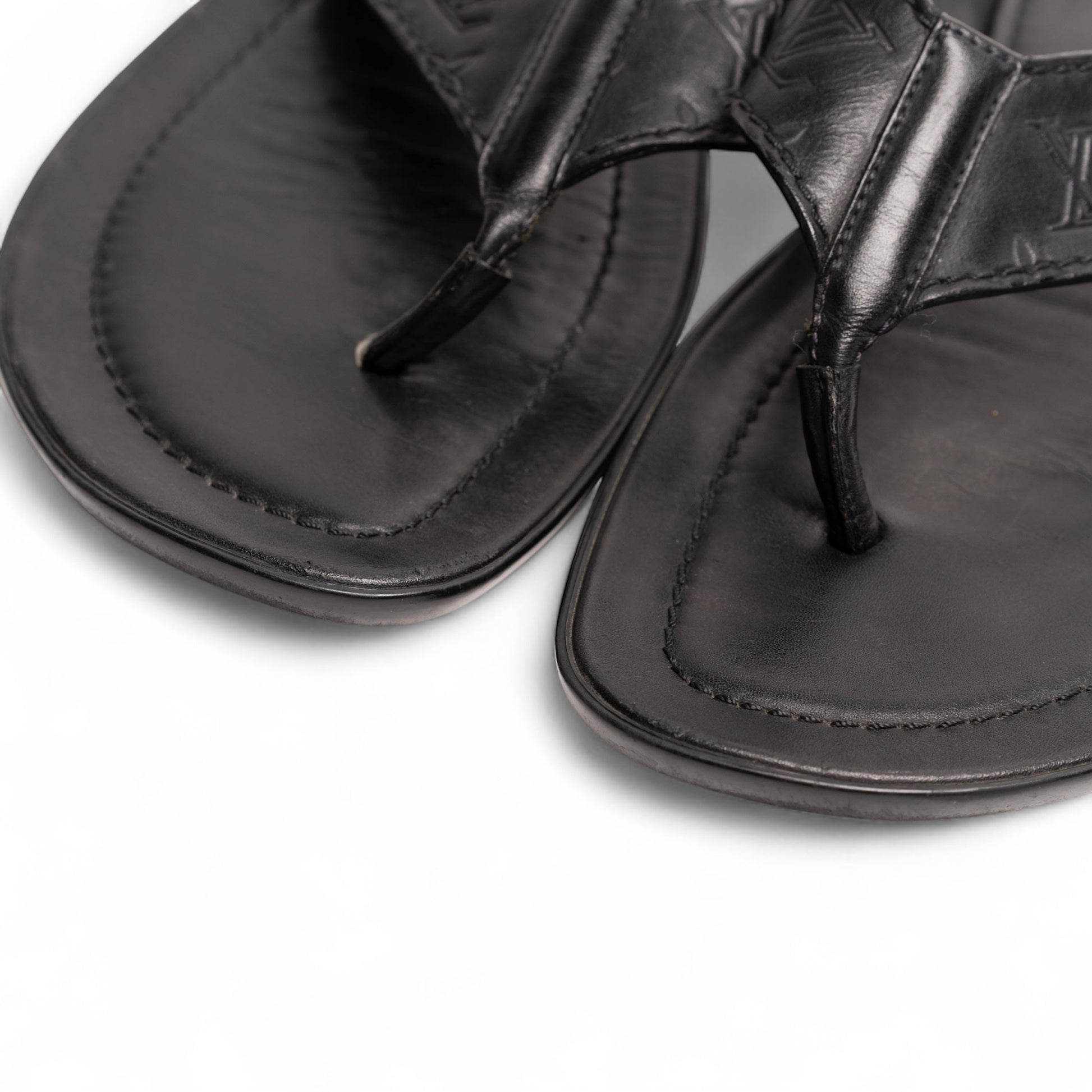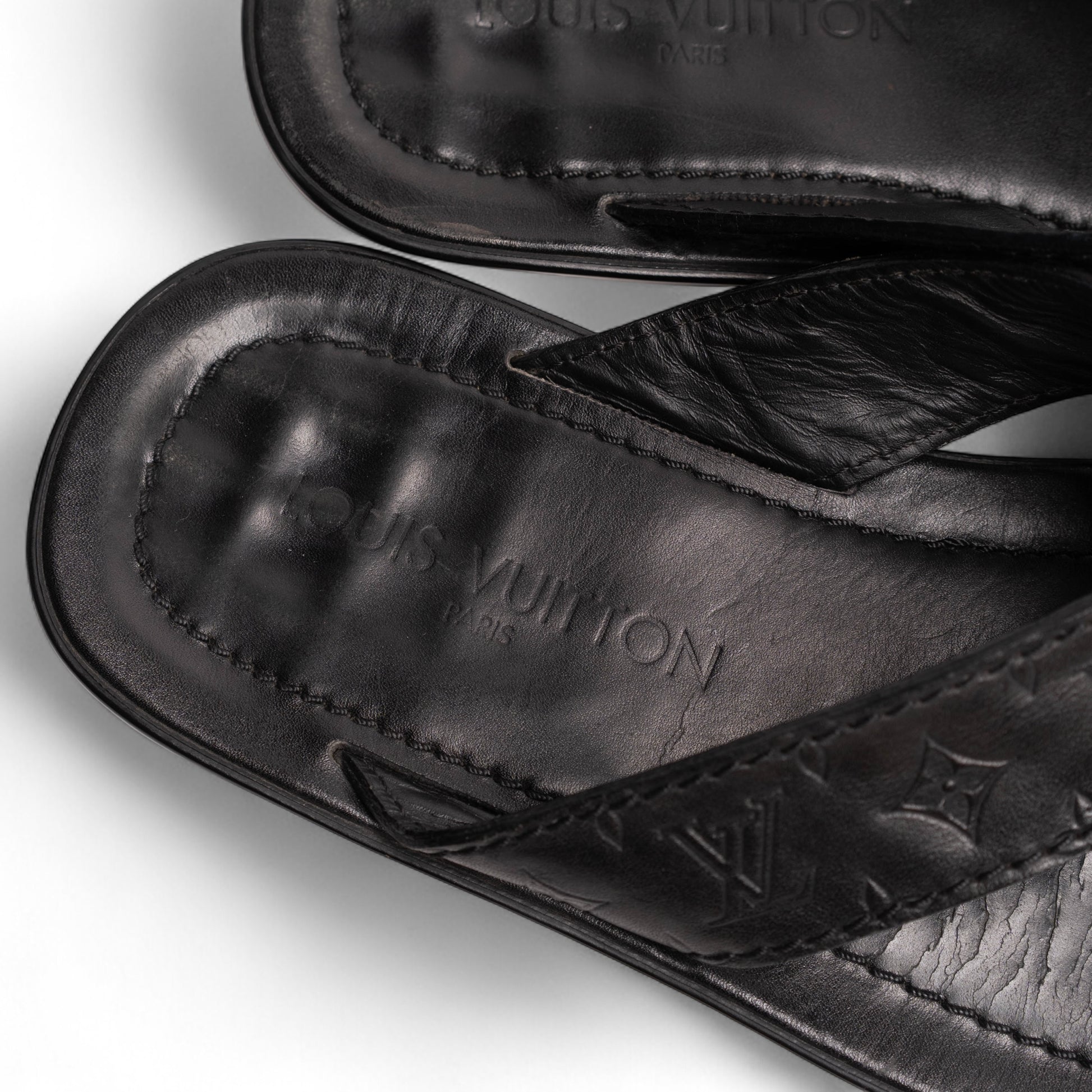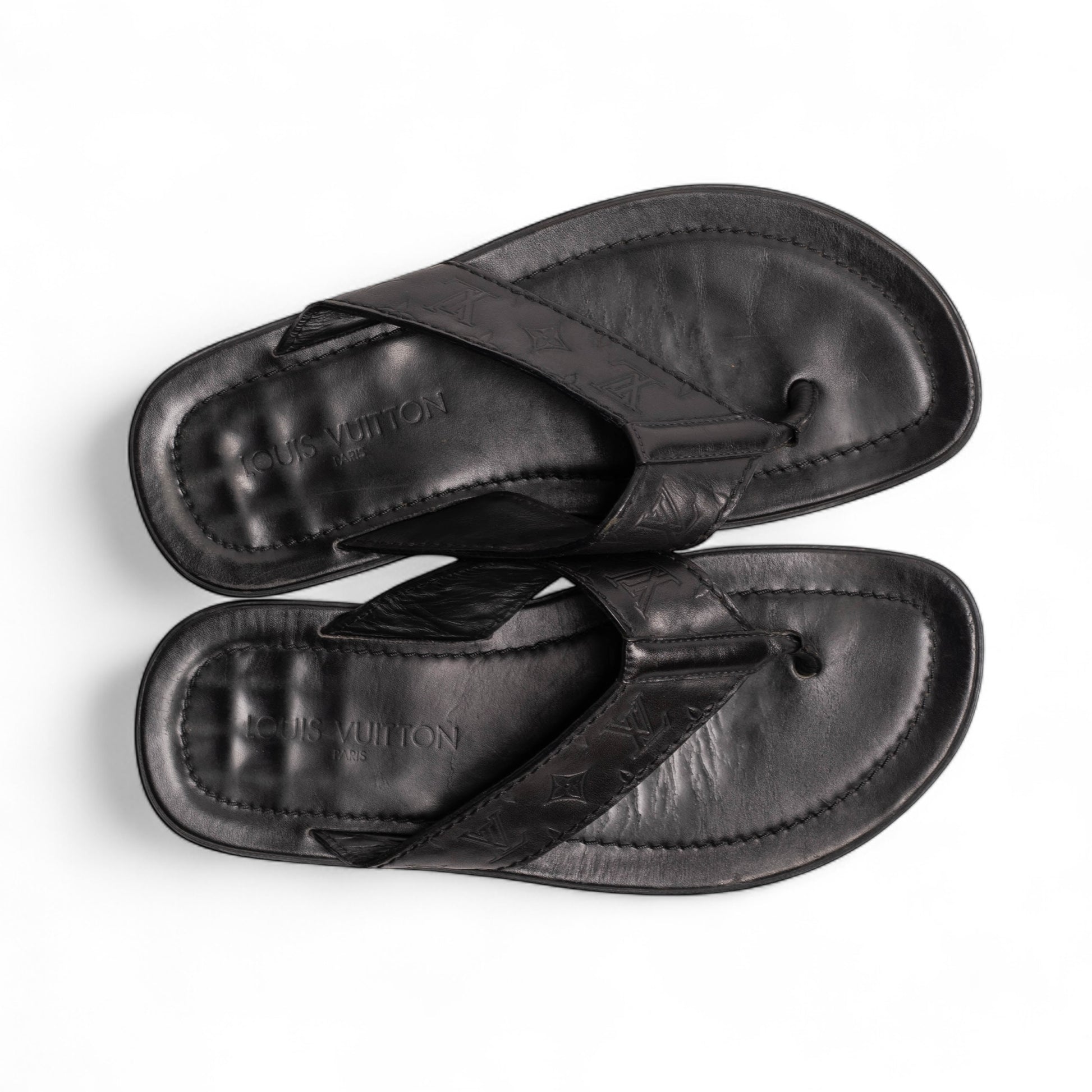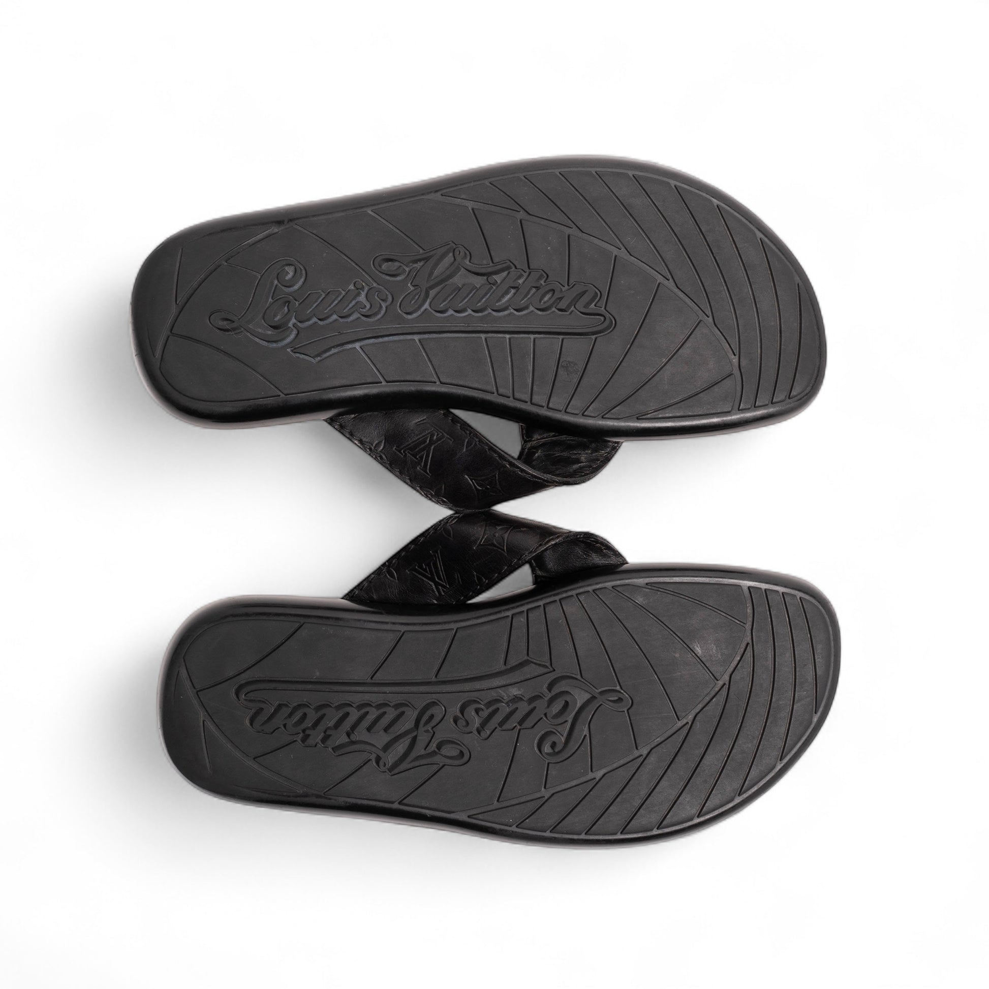 Sandalias Louis Vuitton con monograma para hombre, auténticas y usadas. Estas sandalias de piel de becerro están en buen estado, con signos regulares de uso, como arrugas en la piel y desgaste en las suelas interior y exterior. El código de fecha y la talla están desgastados; quedan restos de un 7 en el interior, lo que indica una talla 7 del Reino Unido. Miden 27,5 cm, así que puedes comprobar si te quedan bien.