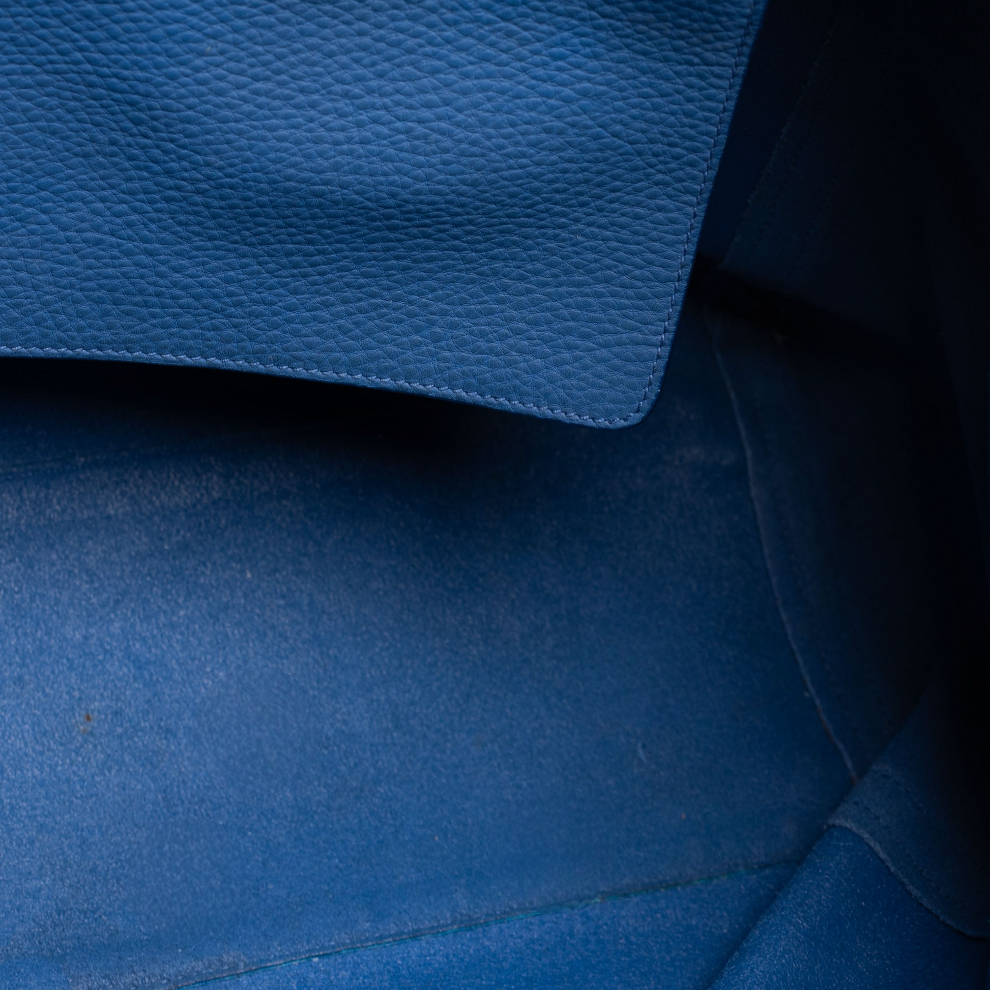 El bolso cuenta con asas dobles, cuero granulado azul cobalto, dos bolsillos interiores con cremallera, dos bolsillos interiores abiertos y herrajes dorados. Los botones dorados en los laterales permiten ajustar la forma del bolso.
