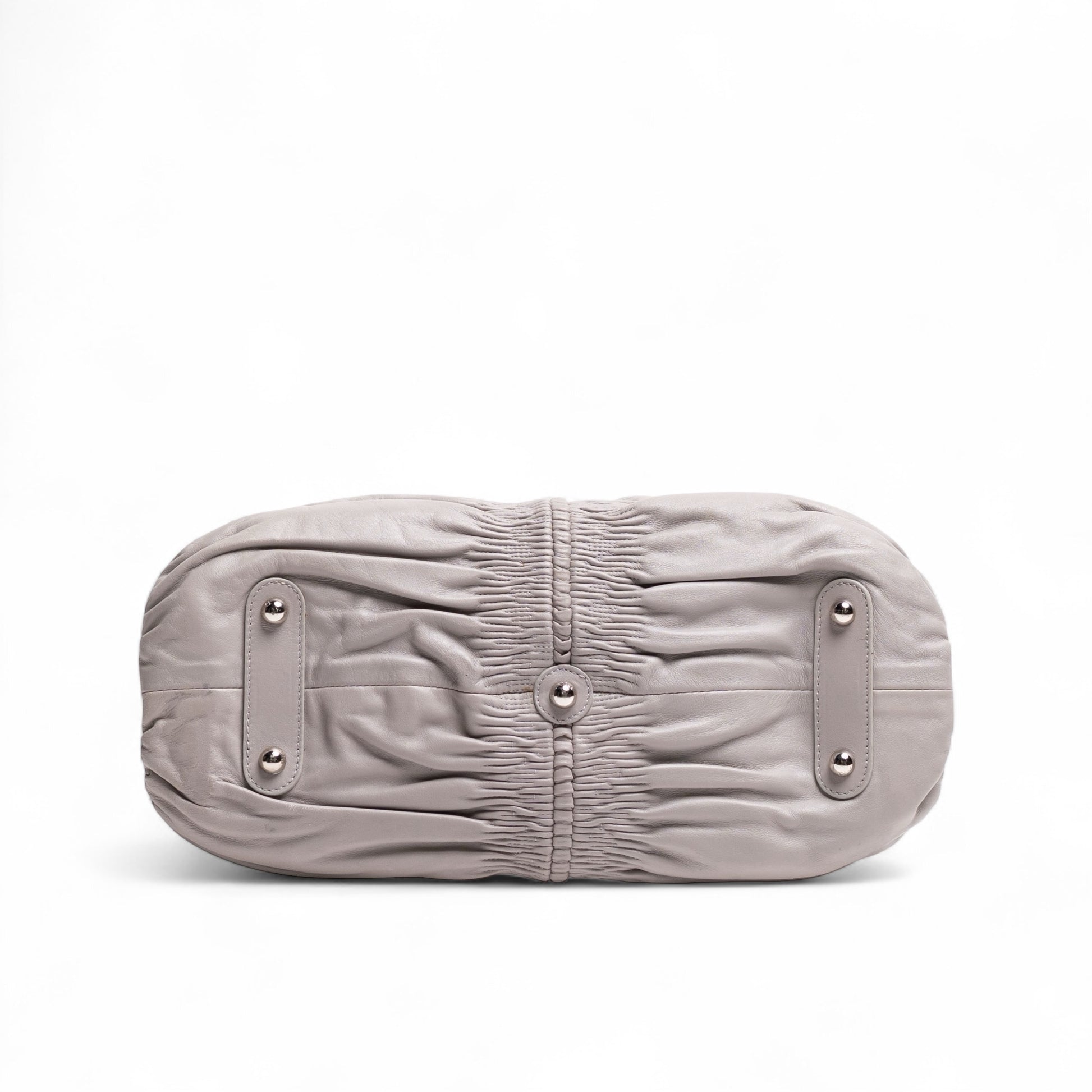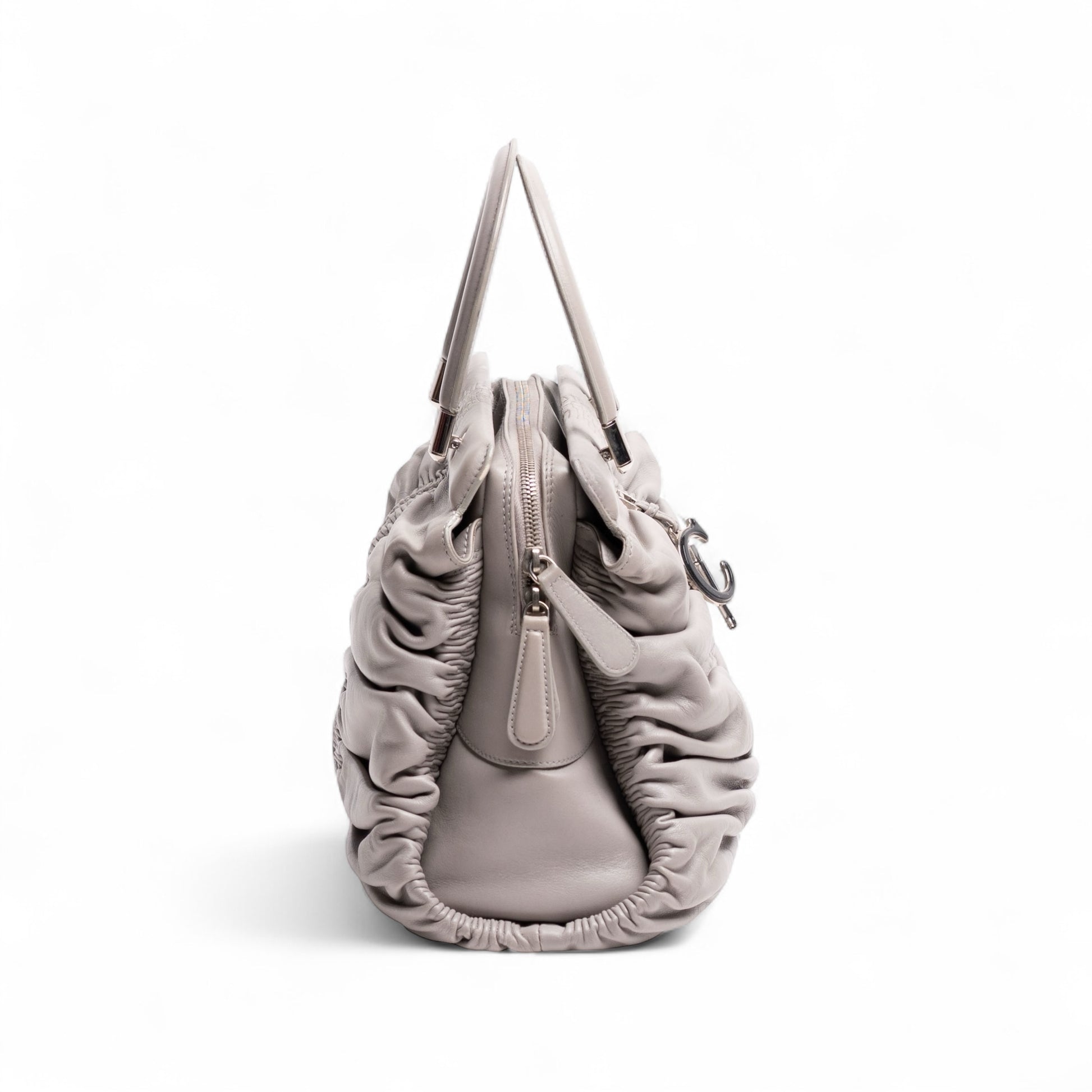 This genuine, pre-owned Christian Dior Karenina Bag is crafted from leather and accented with silver-tone hardware. It showcases a ruched design on both front and back, along with two top handles and a metal CD logo charm. The bag offers front and back pockets separated by a zippered compartment that leads to a main storage area with an additional small interior zip pocket. It is in excellent condition, showing only slight corner wear. Included is the original Dior dust bag.