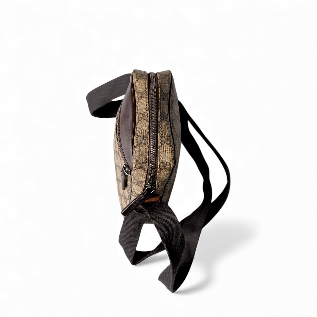 This genuine, pre-owned Gucci Supreme vertical crossbody bag blends monogram canvas with leather in a unisex design. Crafted from brown coated canvas, it includes an adjustable cloth shoulder strap for versatile wear on the shoulder or across the body. Its roomy interior easily holds a phone, large wallet, keys, and daily essentials, making it perfect for hands-free convenience. This vintage piece shows normal wear, including minor surface scratches on the leather and some fading on the strap, reflecting its authentic use over time.