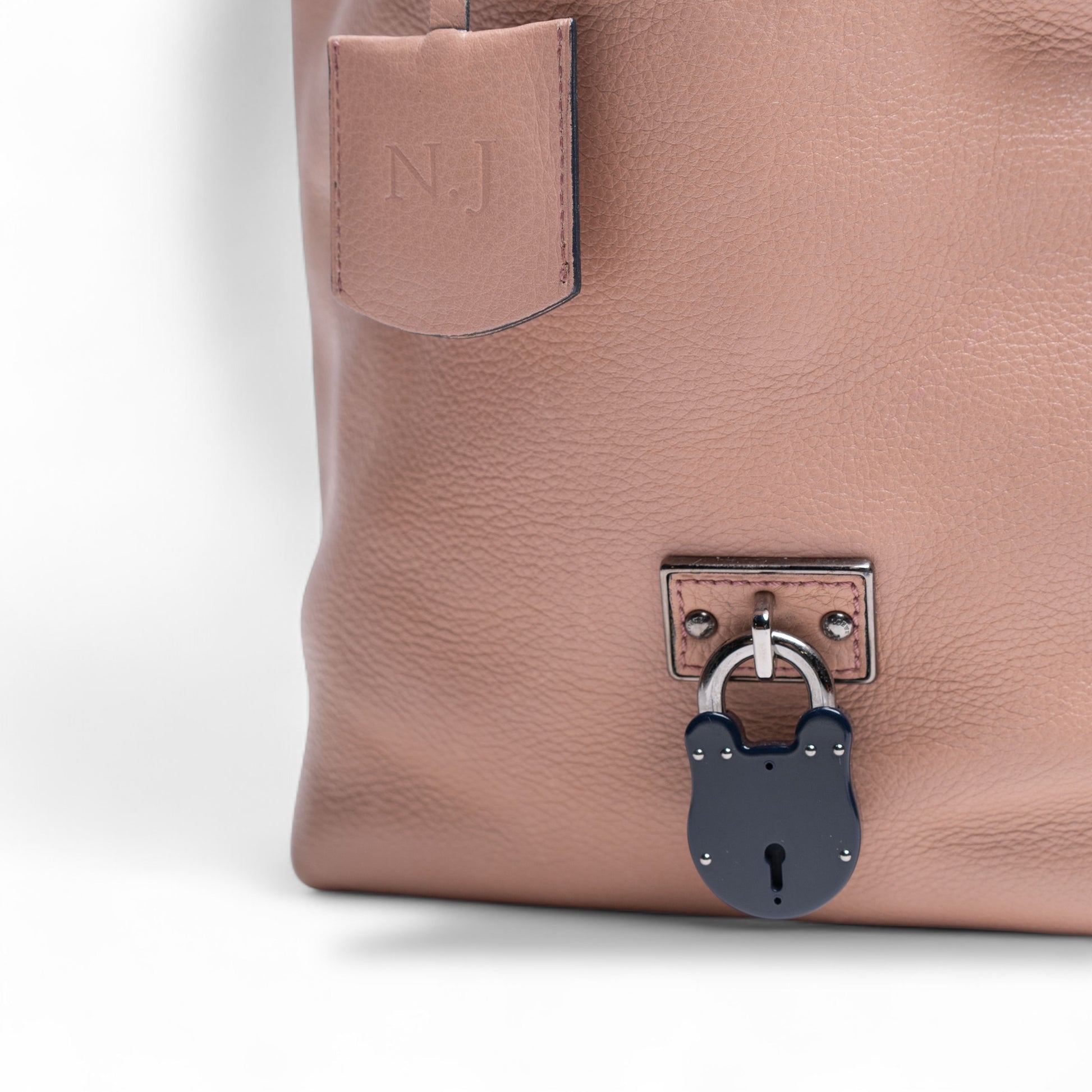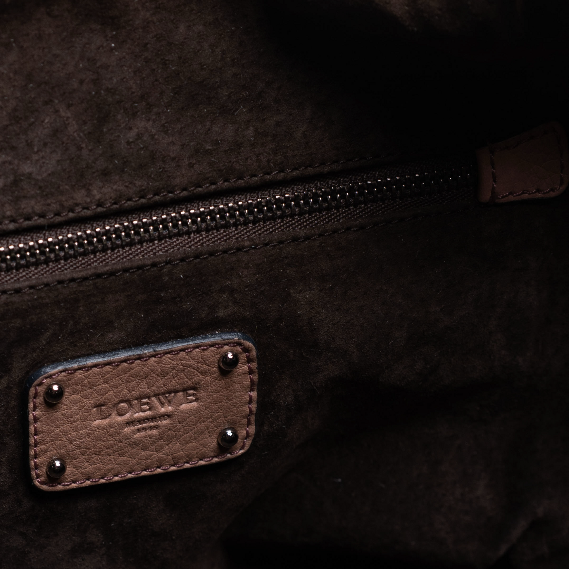 This authentic, pre-owned Loewe Calle Tote in a delicate rose shade is crafted from soft pink Napps leather. The compact design features leather handles and a top opening that reveals a brown microfiber interior with a zipper pocket for secure organization. Despite its small size, the tote offers generous storage while maintaining an elegant and sophisticated appearance. The bag is in excellent condition, having been professionally cleaned, conditioned, and carefully restored to address two minor blemishes. Included is a removable leather clochette embossed with the Loewe logo, personalized on the reverse side with the initials "NJ" from the previous owner.