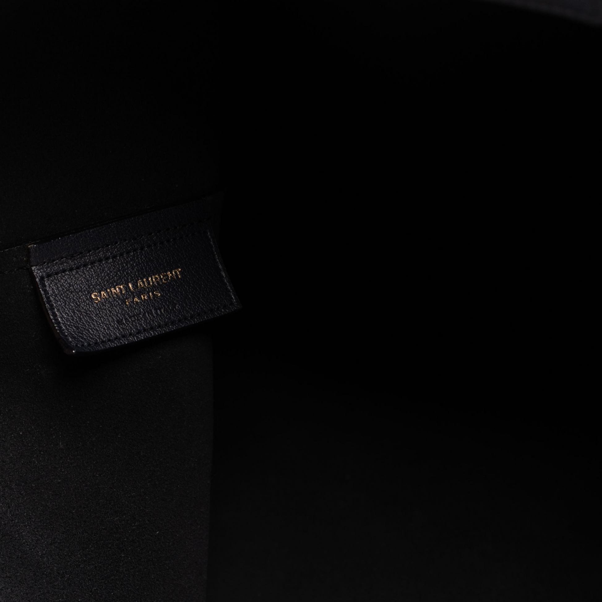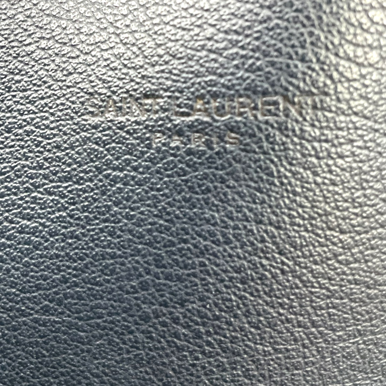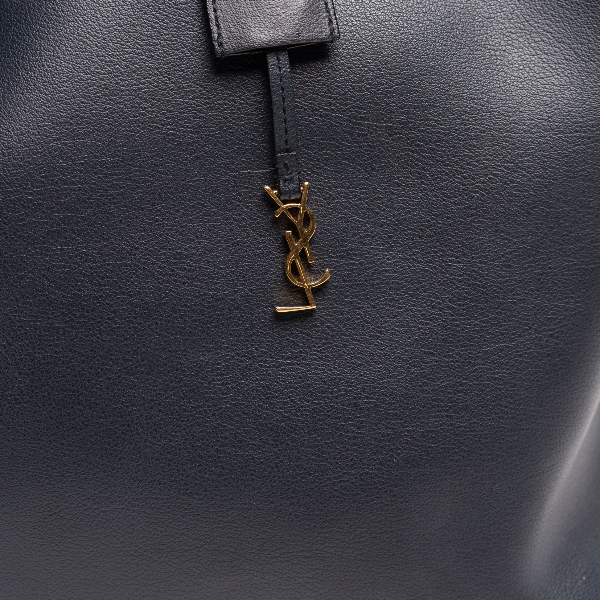 This authentic, pre-owned Yves Saint Laurent Large East/West Shopping Tote showcases luxurious navy blue calfskin leather, offering both durability and timeless elegance. Equipped with double strap handles, it ensures comfortable and versatile carrying options for daily use. The bag is enhanced by a signature YSL logo charm and refined gold-tone hardware, adding a touch of sophistication. Secured by a snap closure, the interior features a soft, suede lining that elevates the tactile experience. Inside, there is a built-in fixture designed to accommodate a removable pouch, though the pouch is not included, allowing for customizable organization. This tote combines classic style with practical design, making it a coveted addition to any collection.